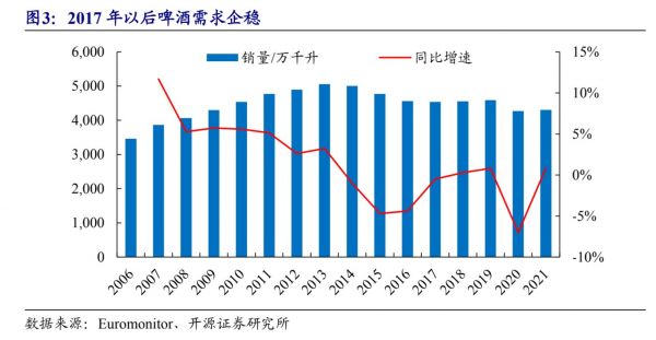 2017年以后啤酒需求平稳 数据来源:Euromonitor 开源证券研究所