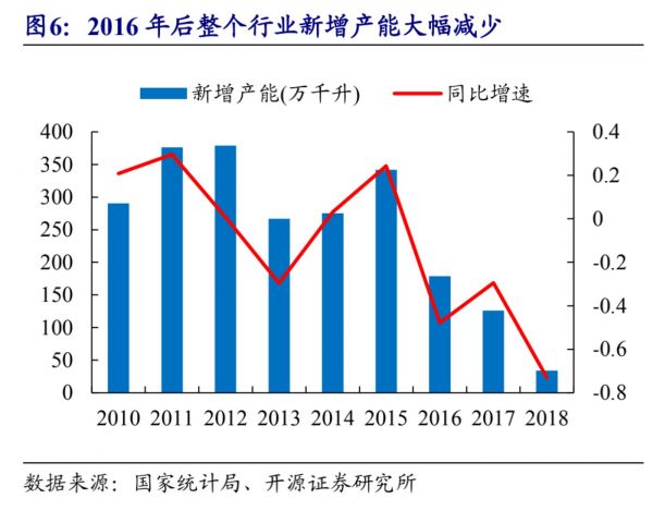 同时,国家统计局数据指出,2016年后整个行业新增产能大幅减少,2018年行业整体新增产能不足50万千升(万吨),是2015年的七分之一。