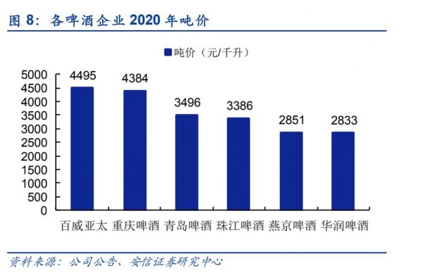 安信证券研究中心数据显示,2020年,华润啤酒吨价为2833元/千升,在百威亚太、重庆啤酒、青岛啤酒、珠江啤酒、燕京啤酒等主流品牌中排名垫底。