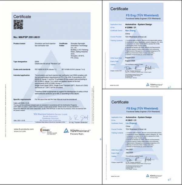 刘志鹏表示,SSIM是国内唯一一张德国技术监督协会TÜV颁发的功能安全标准IEC61508 T2 以及汽车电子标准ISO26262 TCL3等级认证资质的EDA工具产品,获得了进入功能安全这一安全可靠性极高领域的准入资格,并能够支持到最高SIL-D/ASIL-D级别的功能安全类电子芯片仿真。