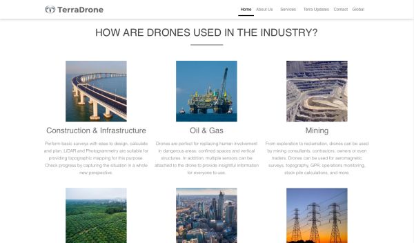 此外,「Terra Drone」参与了多个日本企业及政府合作项目,合作方包括TEPCO、Japan Airlines、KDDI、日本国土交通省等。该公司还与Japan Aerospace Exploration Agency (JAXA)合作,协调载人和无人飞机的飞行管理。该公司目前拥有60名员工,其子公司在全球拥有约500名员工。