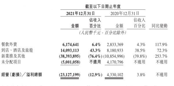 2021年,美团新业务及其他分部的经营亏损达到384亿元,亏损幅度同比扩大了约3.5倍。同期,美团的外卖餐饮业务经营净利为62亿元,同比增长了121.4%;到店、酒店及旅游业务实现经营净利141亿元,同比增长80.0%。