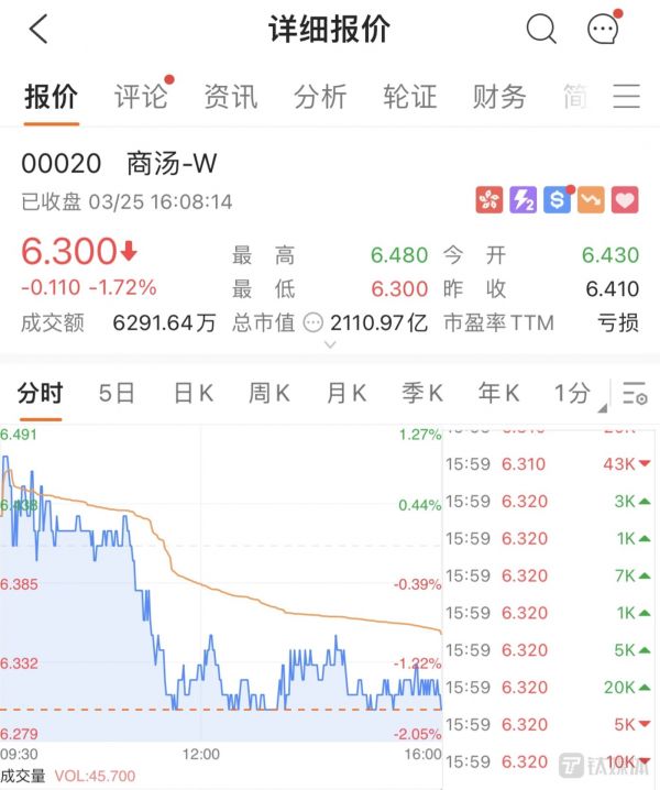 截止3月25日港股收盘,商汤-W报收6.30港元/股,下跌1.72%,总市值达270亿美元。距离其上市后的最高点已下跌超 50%。
