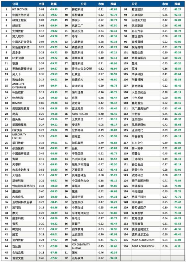 中概股「弃儿」:136家公司市值跌破1亿美元