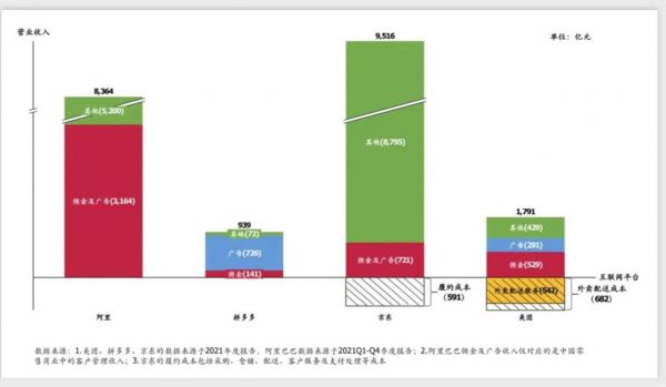 以佣金收入为例,电商商铺佣金的体量远远高于餐饮等服务类电商,阿里的佣金和广告收入加起来超过 3000 亿元,而美团只有不到 900 亿元。