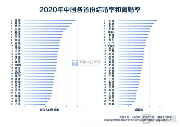 分地区来看,2020年上海常住人口结婚率3.8‰全国最低,其次是浙江、山东、福建、广东;离婚率方面,2020最高的地区是天津市,达到4.93‰,其次是重庆、贵州、吉林、黑龙江。