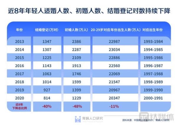 报告根据民政局公布数据分析,2021年全国结婚登记数相比2013年峰值数据减少583万对,为1986年以来最低。而与出生人口更密切相关的初婚人数,从2013年的2385.96万人峰值持续下降 至2020年1228.6万人,下降幅度达48.5%。