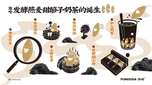 以甜醅子奶茶为例,甜醅子由天然燕麦发酵制成,口味香甜,西北地区人民喜食牛羊肉,而天然的发酵谷物营养更利于人体吸收,因此它成了老少皆宜的传统美食。「放哈」将甜醅子与奶茶、茗茶、酸奶、水果冰沙等进行组合,口感层次丰富。据联合创始人常滢介绍,该系列产品曾多次出现于央视节目中,受到广泛好评。