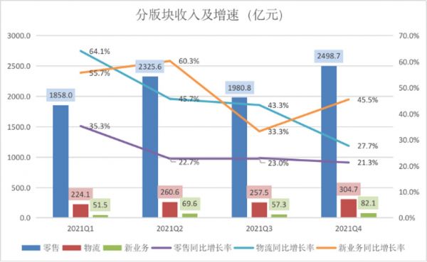 四季度京东营收增速放缓,主要由于零售及物流板块增速均出现下滑。虽然新业务同比增速达到45%,但由于仅占总收入的3%,无法担起带动整体收入增长的大任。