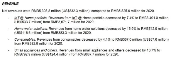 除了净水以外,云米主打的家庭物联网(IOT)领域,发展速度也开始减缓,财报显示,2021年云米在物联网领域的收入为34.010亿元,下降了7.4%,而2020年也正是云米完成物联网品类布局的时间节点。