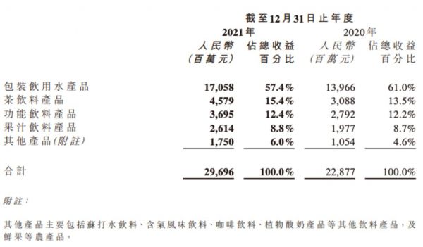 财报数据显示,农夫山泉包装饮用水产品的营收同比增长22.1%至170.58亿元;茶饮料产品的营收同比增长48.3%至45.79亿元;功能饮料产品的营收同比增长32.3%至36.95亿元;果汁饮料产品的营收同比增长32.2%至26.14亿元;其他产品(苏打水、含气饮料、咖啡饮料、植物酸奶等)的营收同比增长66%至17.5亿元。