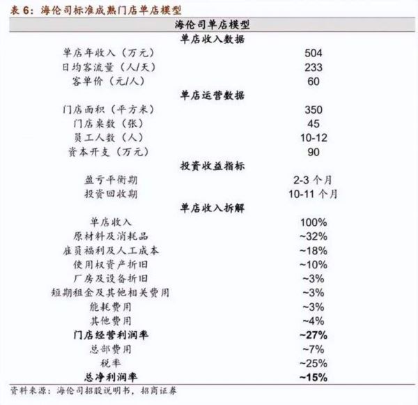海伦司标准成熟门店单店模型来源 / 招商证券研报