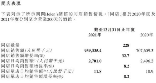 事实上,海伦司的单店盈利能力,并没有像门店数量一样实现快速复制。业绩公告显示,2021年,其门店达到782家,但同店(指营业超过200天的酒馆)数量只有228家,同店单店日均销售额为1.18万元,低于理想单店模型的近1.4万元日均营业额。