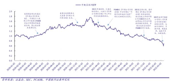 具体时间点如下:(1)2020 年 12 月,美国总统特朗普签署生效《外国公司问责 法案》,引发中概股短期小幅回调;(2)2021 年 3 月,SEC 通过《外国公司问责法案》最终 修正案,以执行信息披露要求,加大中概股退市压力;(3)2021 年 5 月和 2021 年 12 月,《外 国公司问责法案》相关实施细则征求意见及正式落地,引发持续下跌行情;(4)2022 年 3 月, 5 家中概股公司列入《外国公司问责法》暂定清单,如连续三年进入清单将被禁止上市交易, 中概股退市风险转为大概率事件。