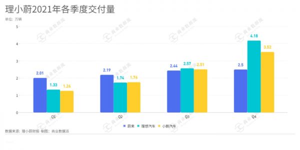 2021年,蔚来的交付量为91429辆,同比增109.1%;理想汽车的交付量为90491辆,同比增177.4%;小鹏汽车的交付量为98155辆,同比增263%。