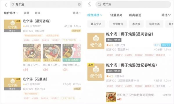 这家主打“原只椰子炖汤”的明星企业,号称1年卖出400万份网红汤,无论在用户还是创投圈中知名度都极高。但如今,投资界分别在美团外卖、饿了么平台搜索吃个汤,结果显示,所有门店均处于休息中。