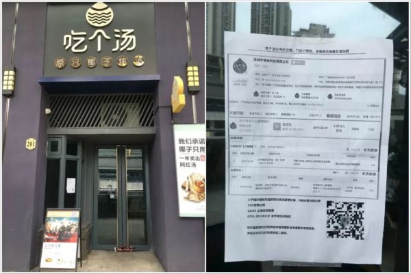 该地负责招商的工作人员向投资界记者讲述:“关店时曾向吃个汤内部人员打听,据说是资金链断裂了。”而后记者又走访星河谷店发现,该店同样处于关门状态。点单台前竖立着一块通知牌:内部设备升级,暂停营业。敬请期待,下周见。但“下周见”一直迟迟没有到来。
