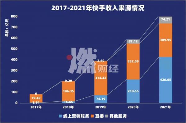 对比来看,2017年、2018年、2019年及2020年,快手直播收入占总收入的比重分别为95.3%、91.7%、80.4%、84.1%及56.5%。但在2021年,线上营销服务业务一跃成为快手第一大收入来源,占比达52.6%吧,而直播业务收入占比降至38.2%。