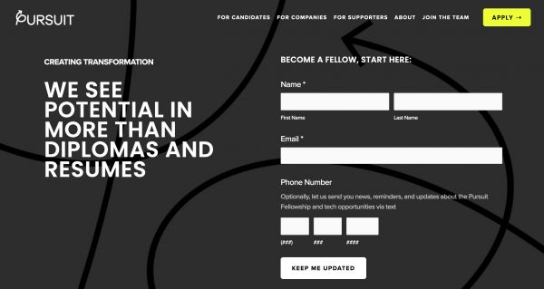 Pursuit的创始人Jukay Hsu观察到,有很多职业培训项目不仅需要花费大量的资金,而且在课程结束后,他们的支持也会终止。这个领域的慈善事业,虽然在某些方面很慷慨,但与问题的严重程度并不相称。