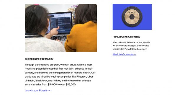 在雇主方面,Pursuit与一些公司合作,为预先设定的职位数量创建一个真正基于技能的招聘流程,但也建议和帮助设计入职和留用流程,以解决常见的人员流失原因,并提供三年的招聘后支持。Pursuit的A.J. Walton表示:“这是我们工作的一个关键方面,帮助公司雇佣和留住那些没有典型背景(比如大学或高等学位等)的人才。”