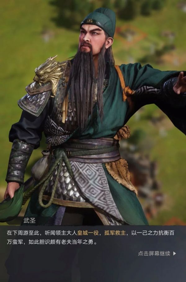游戏进行到一定阶段的时候,一个身披绿色装甲,全身设计明显是“关羽”的英雄将会主动投靠到玩家麾下,为玩家一方提供暂时的帮助。但在《重返帝国》中,这个英雄的名字并不叫“关羽”,而是“武圣”。