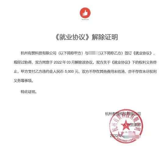 据Tech星球了解,有赞解约了去年秋招时招聘的全部2022届应届生,包括产品、研发、运营等多个岗位。根据三方协议,有赞赔付了被解约应届生们每人5000元。