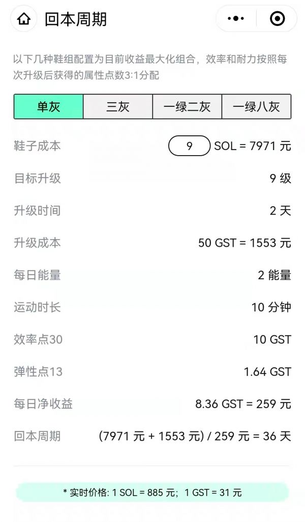 “一天不走路,就少赚600美金,能不去跑嘛。”上个月,Gino所在地区大暴雨连续14天,但为了“边走边赚”,她也没有中断运动,专门买了雨衣,每天穿着雨衣出去慢走1小时。 到3月底时,STEPN有限供应的治理货币GMT在世界级区块链交易平台币安上线后,GMT迎来一波上涨。Gino便先卖掉了一部分GMT,收回了成本。 在STEPN中收益最大化的方式,已经被摸索出来了。在一些STEPN社群中, 有人专门制作了计算回本周期的小程序助手,单灰、三灰、一绿二灰、一绿八灰被视为是新人入场能收益最大化的组合方式。玩家们也会在群里晒着自己的收益,有拥有14双灰鞋、1双绿鞋的打金者(靠游戏赚钱的人)声称,已经实现了日入3000元,而半个月前还只能日入800元。