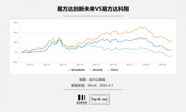 以易方达创新未来为例,陈皓的代表产品易方达科翔同期收益超22%,高出创新未来近18%。