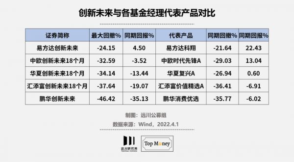 不过,就算和各个基金经理同期管理的其他代表产品相比,5只创新未来基金也无一例外的败下阵来。