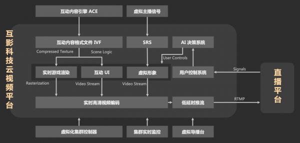 这背后是互影自研的毫秒级响应万人联机互动数字内容技术,亮点在于实时对多个直播间进行控制和协同。互影在这场大型游戏中扮演着一个虚拟导播台的角色,同时控制着几十个直播间的屏幕内容和弹幕,它在云端同时为 3 名 NPC 渲染时间轴相同但画面视角不同的视频内容,并且在画面中混合了 NPC 专属的虚拟数字形象“河狸助手”不断与观众互动,之后再用高清视频编码以低延时推流的方式将画面同时推送给几十名主播和直播平台,再收集所有主播直播间观众回传的信号,然后由 AI 决策系统基于观众的信号判断接下来推送的视频内容。