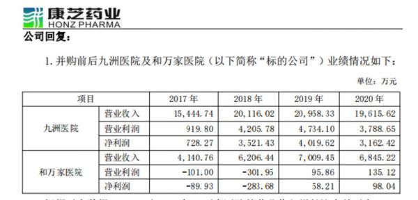 (九洲医院、和万家医院近年业绩情况,来源:康芝药业公告)