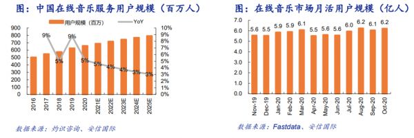 灼识咨询统计的数据显示,中国在线音乐服务用户规模增速在2019年达到9%的巅峰,此后逐渐下滑。与此同时,另一份来自Fastdata的报告也指出,中国在线音乐市场月活用户规模在过去两年间几无变化,一直停留在6亿左右。