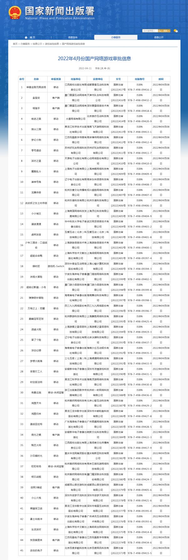 4月11日晚间,国家新闻出版署官方网站公布了2022年4月份国产网络游戏审批信息,共45款游戏获得版号。这是自2022年7月以来,国家新闻出版署审批通过的首批国产网络游戏。