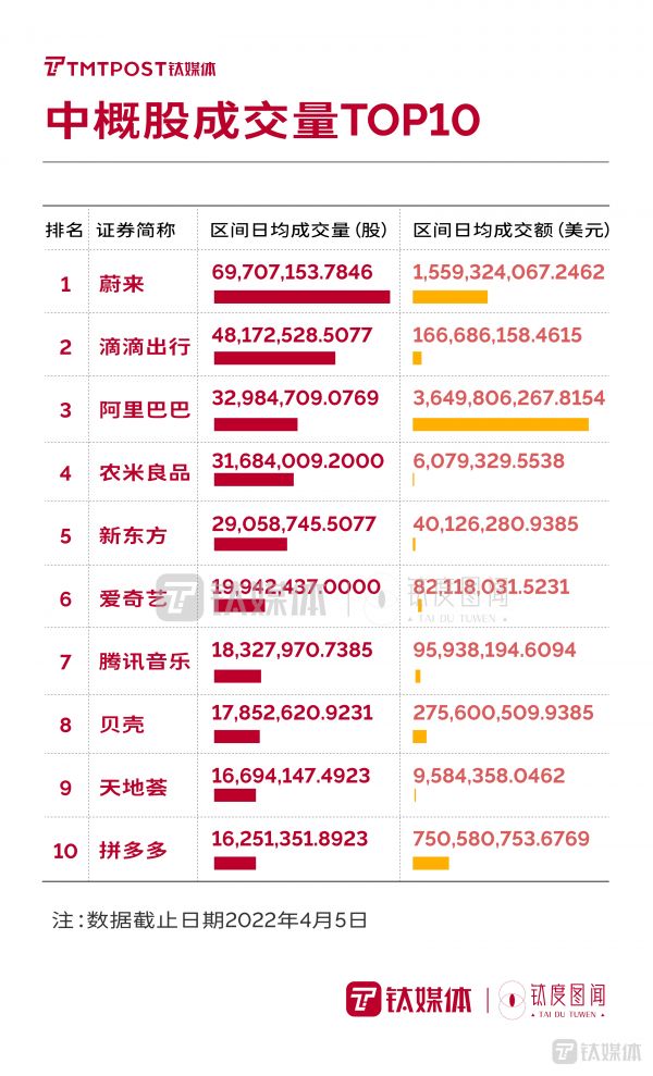 此外,从2022年1月1日到4月5日的3个多月时间里,日均成交量超1000万股的有19家,成交量在100万至1000万股的有74家,成交量在10万至100万股之间的有131家,56家中概股公司日均成交量低于10万股。