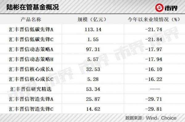 2021年,陆彬虽然没能再次夺得股基冠军,但其管理的三只基金——汇丰晋信低碳先锋、汇丰晋信动态策略、汇丰晋信先锋制造,它们的涨幅均在40%以上,全部排名同类基金前10%。截至这一年年末,陆彬在管规模飙升至300多亿元。
