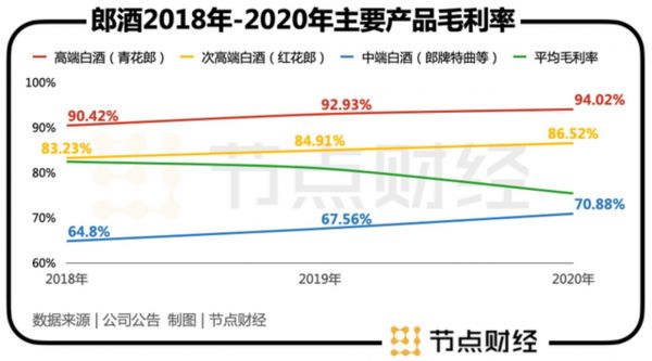 郎酒的产品收入也体现了这种结构。从2017年至2020年,其高端和次高端的收入占比从40%增长到了65%,其产品主要就是青、红花郎酱香酒。而从毛利率来看,据招股书显示,2020年郎酒的高端毛利率达94.02%,甚至压了茅台一头,而所有产品的平均毛利率也达到82.43%。