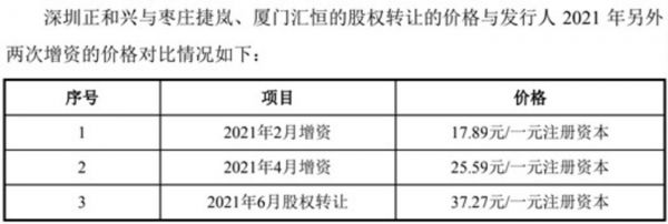 (深圳正和兴股权转让价格与同年增资价格对比,来源:振华风光首轮回复问询意见)