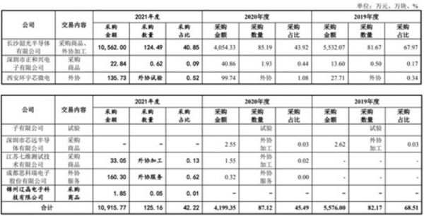 其中尤以对长沙韶光半导体有限公司(以下简称“长沙韶光”)的业务见多。公开资料显示,2010年张亚增资入主长沙韶光,2年后就促成该公司与振华风光的合作并延续至今。之后的2017、2018年,张亚分两次转让其持有的长沙韶光70%、30%股权给航锦科技(000818.SZ)。但2019年-2021年,长沙韶光依然位列振华风光第一大供应商,向长沙韶光采购芯片和外协加工金额达到5532.07万元、4054.33万元、10562万元,占采购额的67.97%、43.92%、40.85%。同时振华风光还向长沙韶光销售商品,2019年-2021年的额度分别为15.61万元、25.75万元和35.04万元。