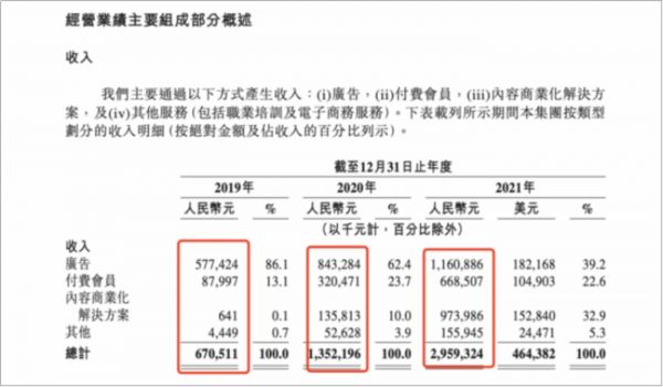 当然,知乎还有一些其他营收来源。比如于2020年推出的职业培训服务,再比如电子商务业务,但这些业务的营收对整个平台来说,起不到决定性的作用。