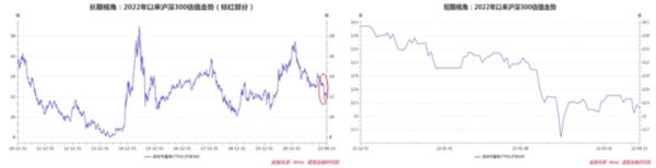 不妨来看两张图。对于沪深300指数开年以来的市盈率波动,如果放到十年回顾视角中来看,基本是一段直线跳水的走势(左图标红部分),如果走近去看,虽整体下行,但每天涨涨跌跌,要曲折地多。