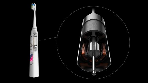 为了解决电机的衰减问题,一晤未来实验室自主开发了hypermag ® 工业永磁同步伺服电机。相对于传统单相电机,这一三相电机方案具备体积小、重量轻、噪音小的特点。这也是伺服电机首次应用于电动牙刷产品,此类电机过去多应用于精密仪器,如机械手臂、医疗器械等专业领域。