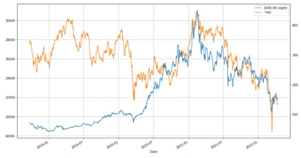 这对于美团的影响又是什么呢?我们又整理了美团与恒生指数的走势情况,见下图