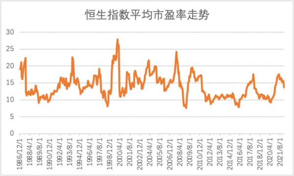如果我们用平均市盈率代表市场的平均估值水平,那么在过去的20余年里恒生指数的平均市盈率整体上呈现出: