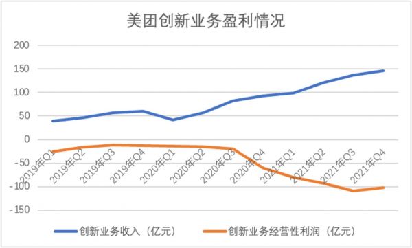 如开篇所言,在2020年之前美团对创新业务是不断收敛的,总收入维持在平稳区间,经营性利润又在改善中。但在此轮牛市之后,在市场估值模型以及企业可获得便利融资能力双重因素下,加大了对创新业务的投入。