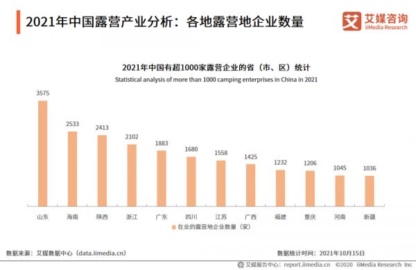据艾媒咨询数据显示,截至2021年10月15日,国内露营营地企业共有超3万家,其中2020和2021年增长猛进,分别新增超8000家和超15000家露营地企业。