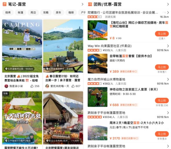 大众点评上露营相关的笔记和团购