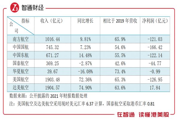 2021年,航空行业恢复元气,国内三大航空公司收入均实现恢复增长,其中南方航空(01055)为行业龙头,收入增长9.81%,中国东航(00670)增长较快,为14.48%,中小航空公司包括国泰及华夏航空等业绩下滑。海外以美国航空及达美航空为代表,期间收入增长均超过70%。