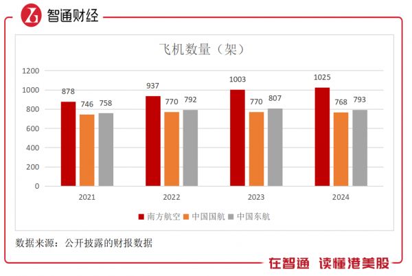实际上,三大航空公司均公布了未来三年的扩张计划,其中南航到2024年飞机数量将达到1025家,每年都保持净增加态势,而反观东航及国航的计划,2022-2024年三年基本零净增,作为收益的载体,飞机数量多少基本代表了未来的成长空间。按照计划,2024年南航的飞机数量将逼近达美航空。
