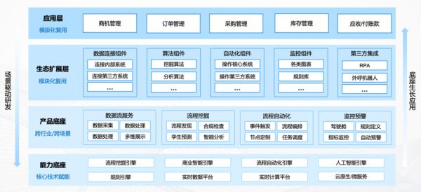 本文报道的璇星科技定位为中国版 Celonis ,基于团队过去十余年在 ToB 产品研发领域积累的经验,为大型企业打造了一款数智化转型底座,可以满足企业丰富的业务流程场景和需求。现在已发布的产品模块包含数据流服务、流程挖掘、监控预警和流程自动化等。未来,还将基于数智化底座衍生出更多的产品模块。具体来说:
