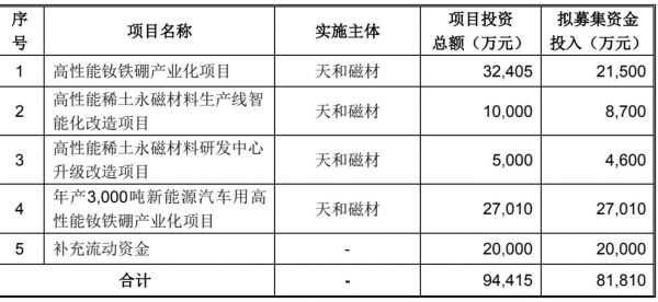 今年3月,天和磁材再度向A股发起冲击,从科创板改道上交所主板,保荐机构也换成申港证券。对比来看,此次IPO,公司拟募集资金增加至81810万元,同时在原来扩能、改造、研发三个项目外,新增了年产3000吨新能源汽车用高性能钕铁硼产业化项目,且补充流动资金也从此前的7000万元增加至2亿元。